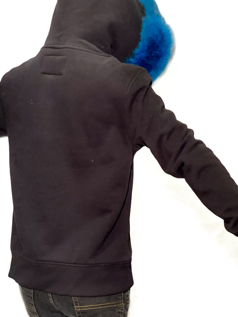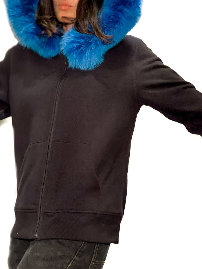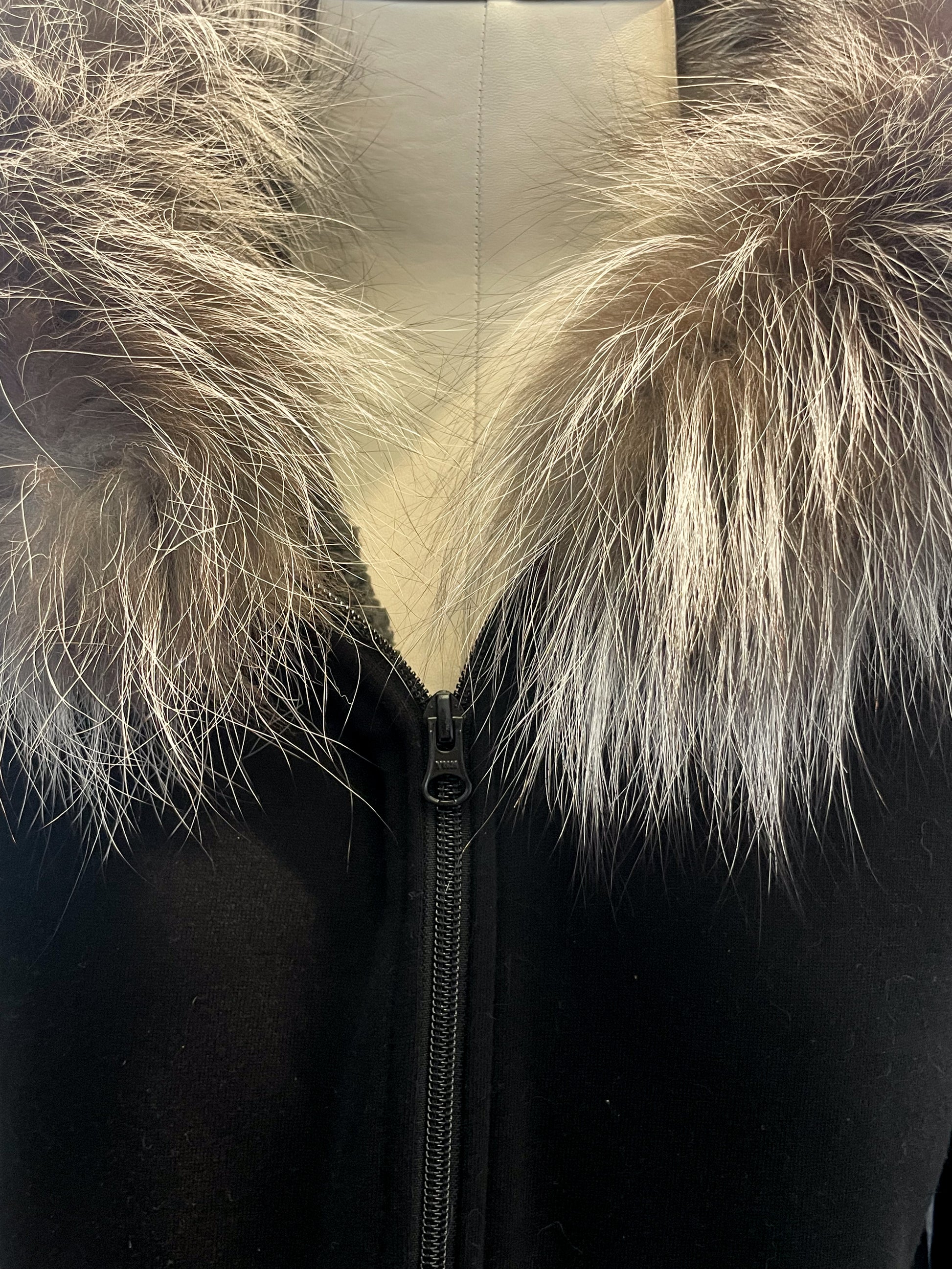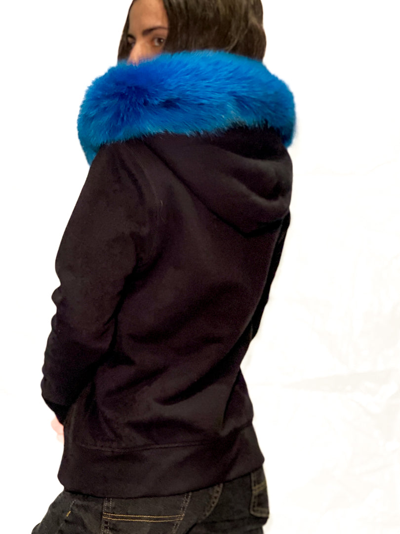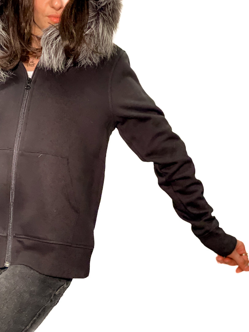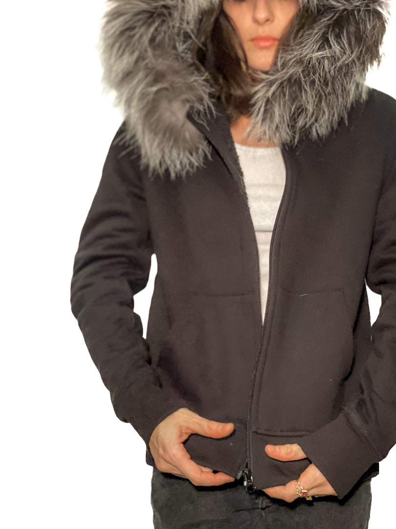 These sherpa lined hoodies are upcycled gray fox fur around the hood in gray and blue fox! Stay warm and stylish while making an impact with our Upcycled Fur Hoodie! The soft sherpa lining provides ultimate comfort and the upcycled gray fox fur adds a touch of luxury. Make a statement with our sustainable fashion choice.